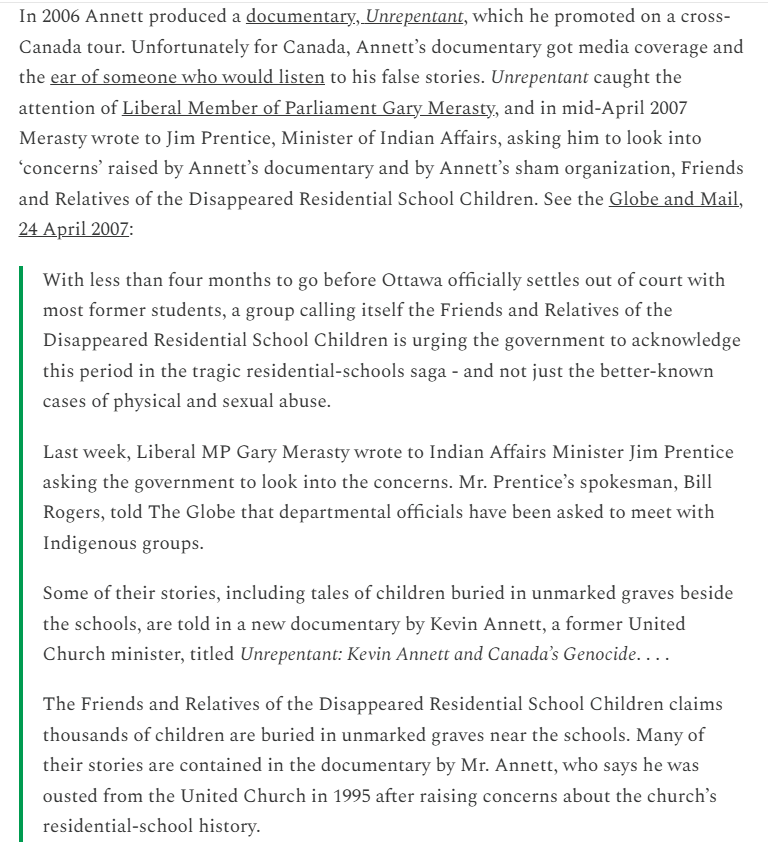 The second major source was Kevin Annett. In 2006, Annett produced a “documentary” with the title “Unrepentant: Kevin Annett and Canada’s Genocide”.