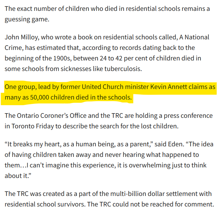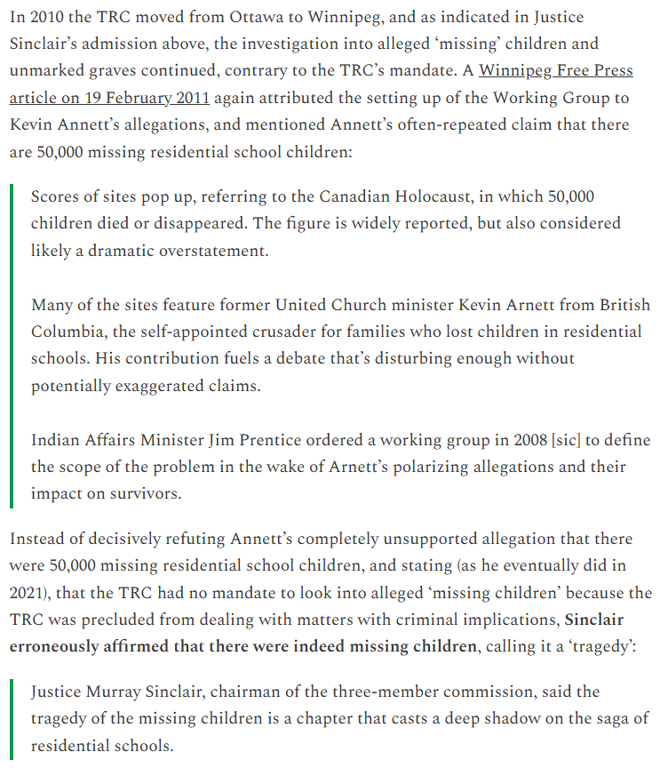 Because the working group’s recommendations were accepted by the Truth and Reconciliation Commission, Annett’s allegations about “missing children” were incorporated into the Truth and Reconciliation Commission’s research. For a number of years, Annett had been claiming that 50,000 children had died in the schools.