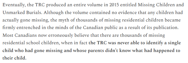 In Green’s article, she documents how Annett’s claims about thousands of missing chldren were absorbed by the Truth and Reconciliation Commission, in spite of the fact that an investigation of criminal acts was “contrary to the TRC’s mandate”: