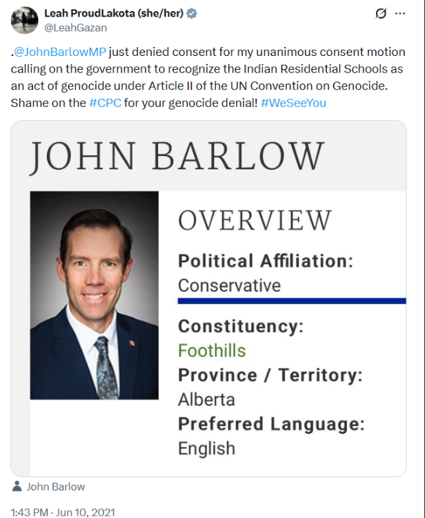 As a result, Leah Gazan, the MP for Winnipeg Centre, pressed for a motion declaring that the residential schools were “genocidal”. She provided this introduction to what she was intending on June 9, 2021.