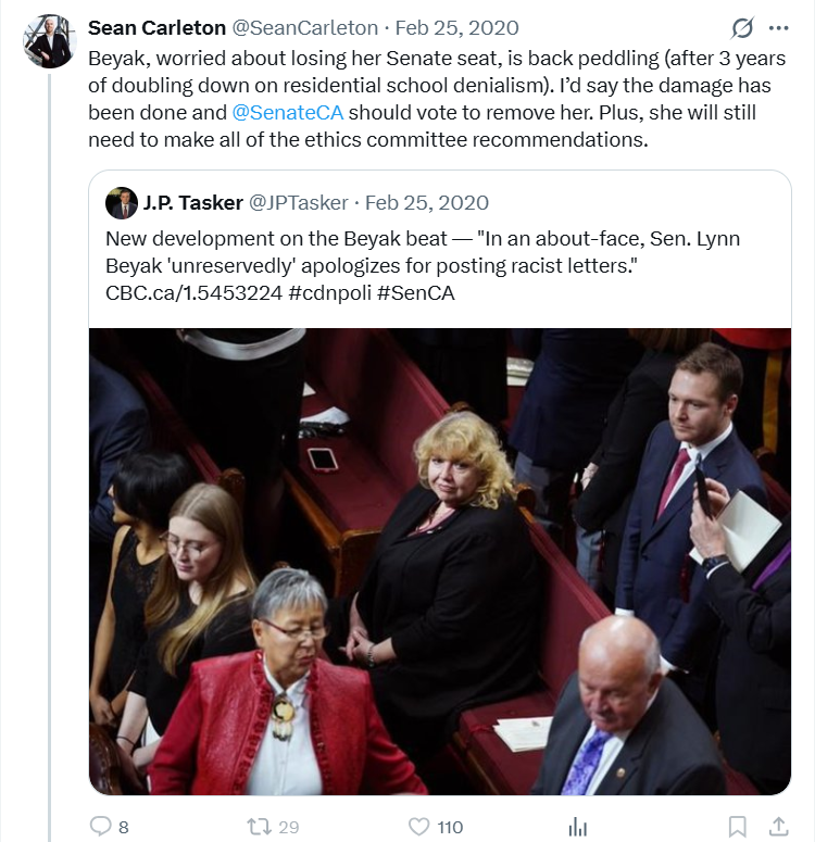 This reference to “denial” was an attempt to equate those who challenged that the residential schools were genocidal with holocaust deniers. This resulted in Lynn Beyak being castigated and eventually purged from the Senate for saying that many who ran the schools had good intentions. In the Winter of 2020, Mount Royal University professor Sean Carleton (who moved to the University of Manitoba in the Fall of 2020) began to use the term “residential school denialism”.