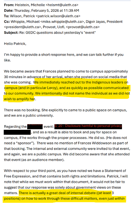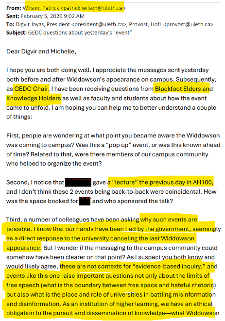 On February 5, 2026, one day after Frances Widdowson and Anthony Hall, along with their respective spouses, were assaulted, intimidated, harassed, and had their property damaged and stolen for trying to engage in a Spectrum Street Epistemology session at the University of Lethbridge, an email exchange took place between professor and Gender, Equity & Diversity Committee Chair Patrick Wilson and Provost Michelle Helstein. This email shows the totalitarianism that is actively encouraged by faculty and administrators, answering the question as to why students at this institution have become so deranged.
