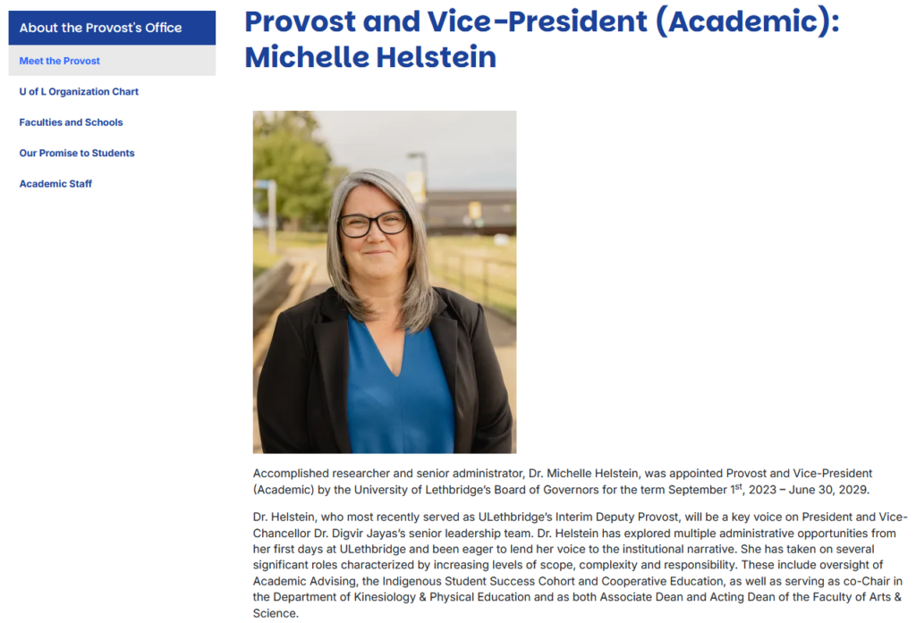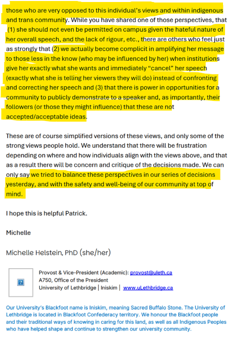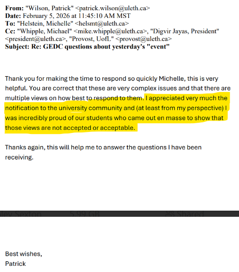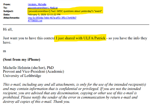 Helstein then forwarded Patrick Wilson’s messages to the “Provost Committee”, along with her message to the University of Lethbridge Faculty Association (ULFA).