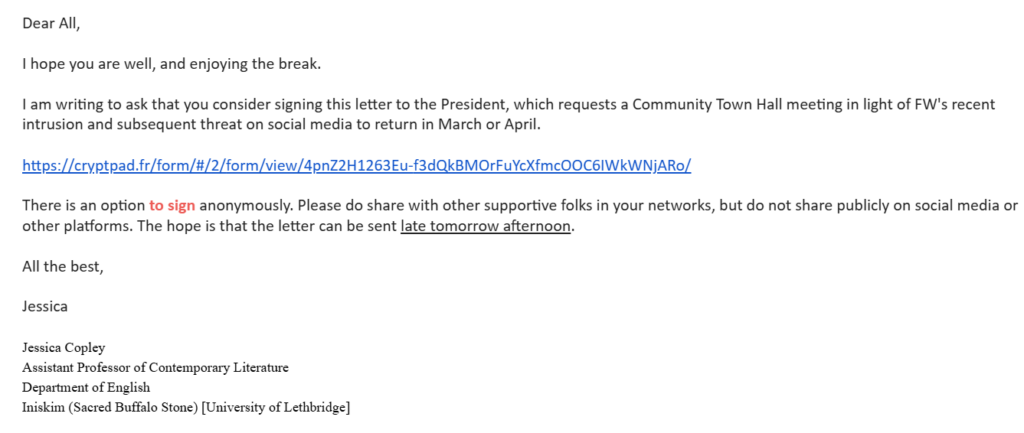 The University of Lethbridge continues to beclown itself. The latest is an email from Jessica Copley, an Assistant Professor of Contemporary Literatures. In this email, Copley provides her colleagues with a letter to the President, and asks them to sign it. She also provides people with an option to sign anonymously, which will help them avoid accountability for their actions.