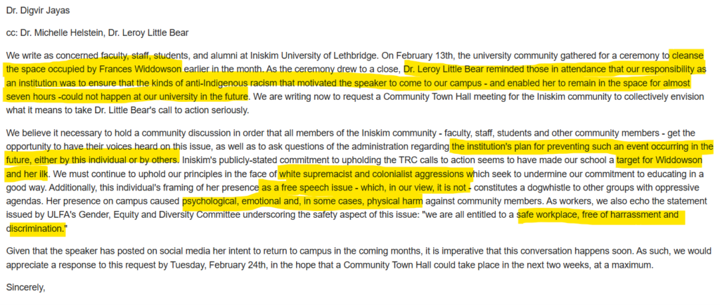 The letter attached to Copley’s email, copied to the Provost Michelle Helstein and Vice-Provost Leroy Little Bear, makes a case for excluding Widdowson and her “ilk” from campus. This sentiment seems to have been encouraged by Vice-Provost Little Bear on the basis that he claims, without evidence, that Widdowson is “motivated” by “anti-indigenous racism”.