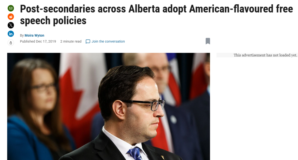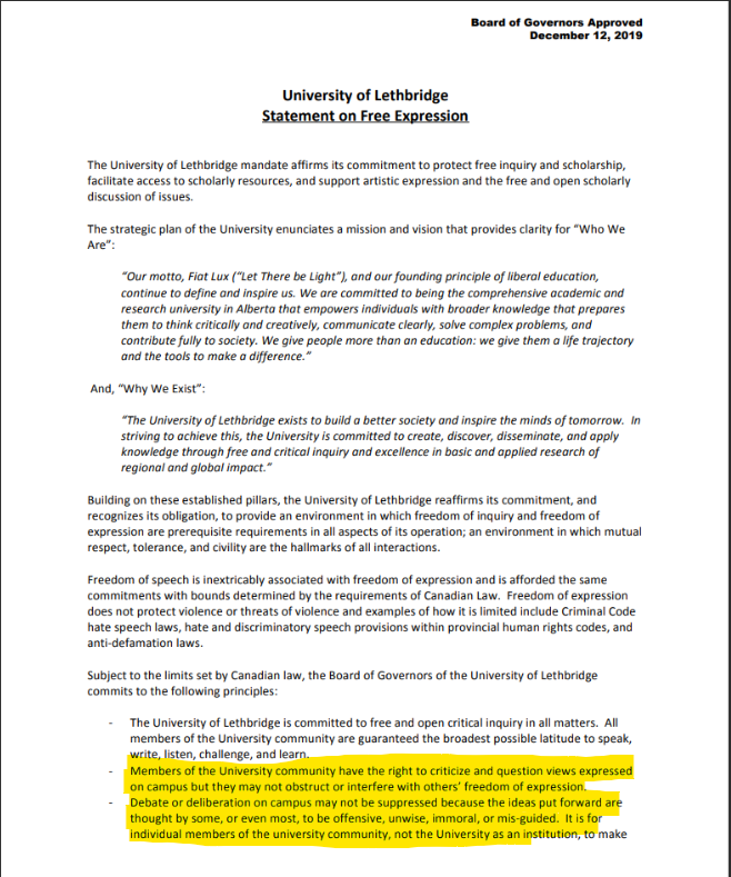 The University of Lethbridge developed a policy as a result of the free speech directive. This directive asserts that “debates or deliberations on campus may not be suppressed” because they are “offensive, unwise, immoral, or mis-guided”.
