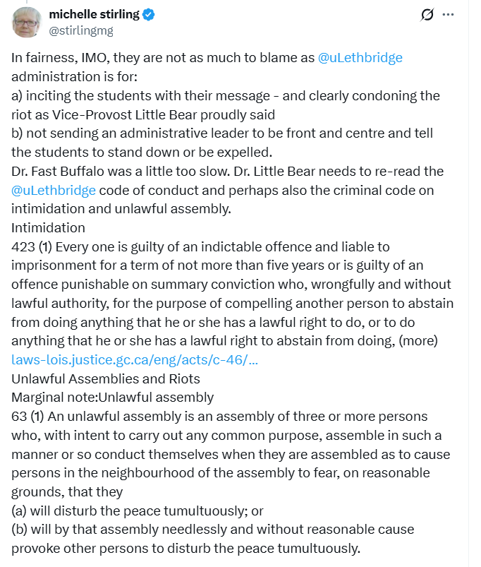 As Michelle Stirling has pointed out, what Vice-Provost Little Bear was doing was promoting intimidation and unlawful assembly.