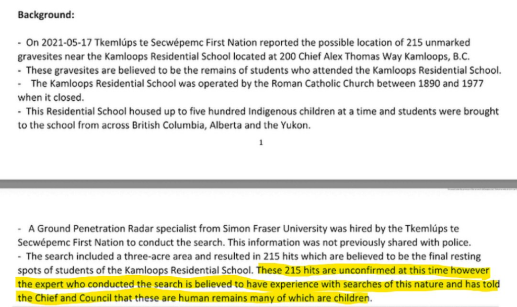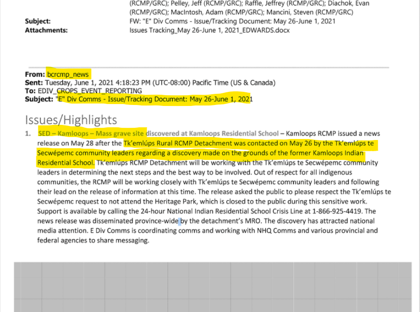 The RCMP was contacted on May 26, 2021, one day before the Press Release was provided to the media (through CFJC journalist James Peters). Publicly, the RCMP was declaring that a “discovery” had been made.