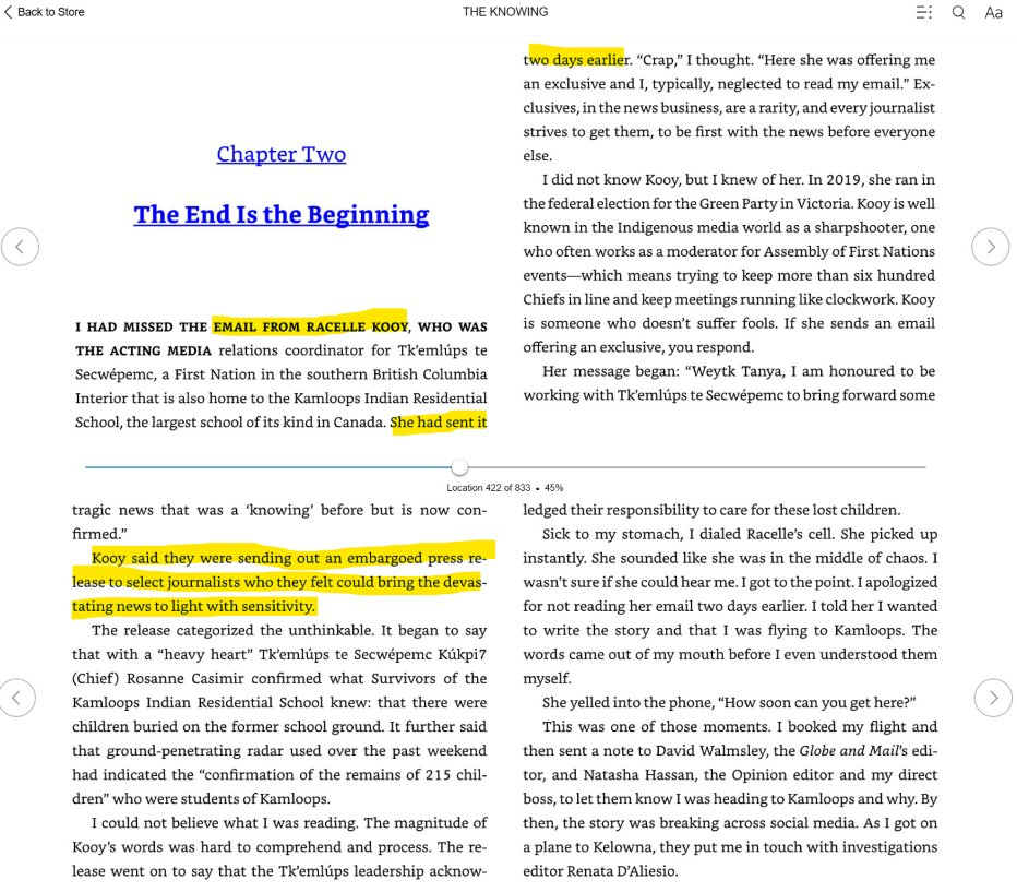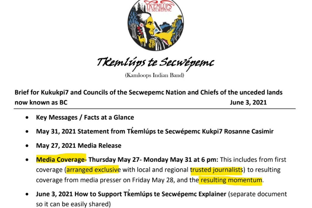 In Tanya Talaga’s book “The Knowing”, it is revealed that Racelle Kooy controlled media communications. Talaga was one of the journalists who was contacted while the Press Release was embargoed on May 25 and 26. This Press Release was then given as a “scoop” to James Peters on May 27, 2021.