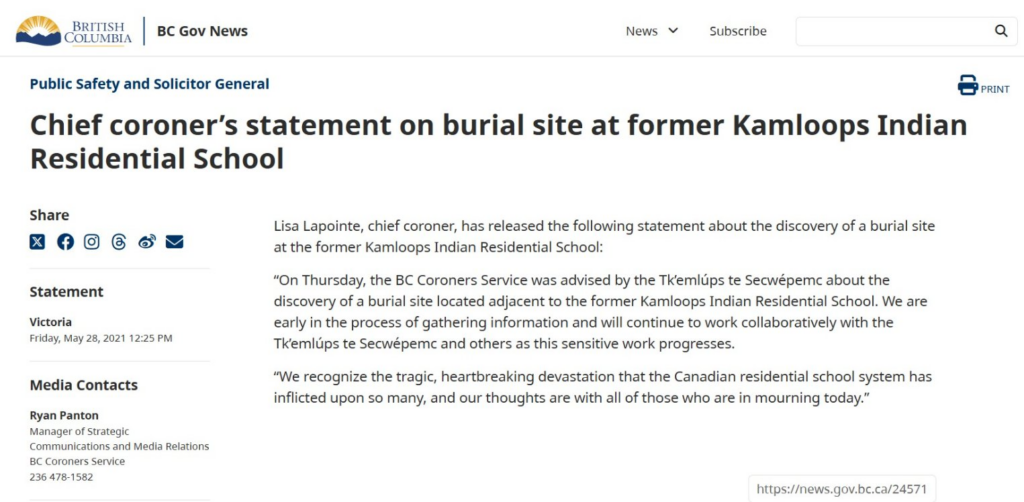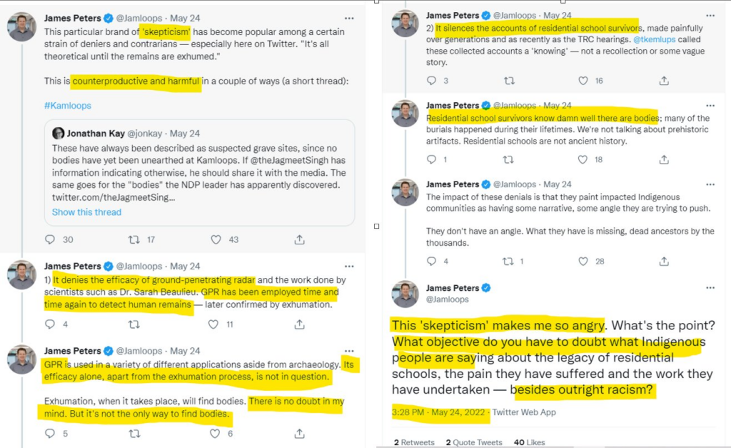 James Peters and Dylana Kneeshaw were both involved in disseminating articles based on the Kamloops Indian Band’s Press Release on May 27, 2021. Kneeshaw is married to a Kamloops Indian Band member, and Peters is an advocacy journalist.