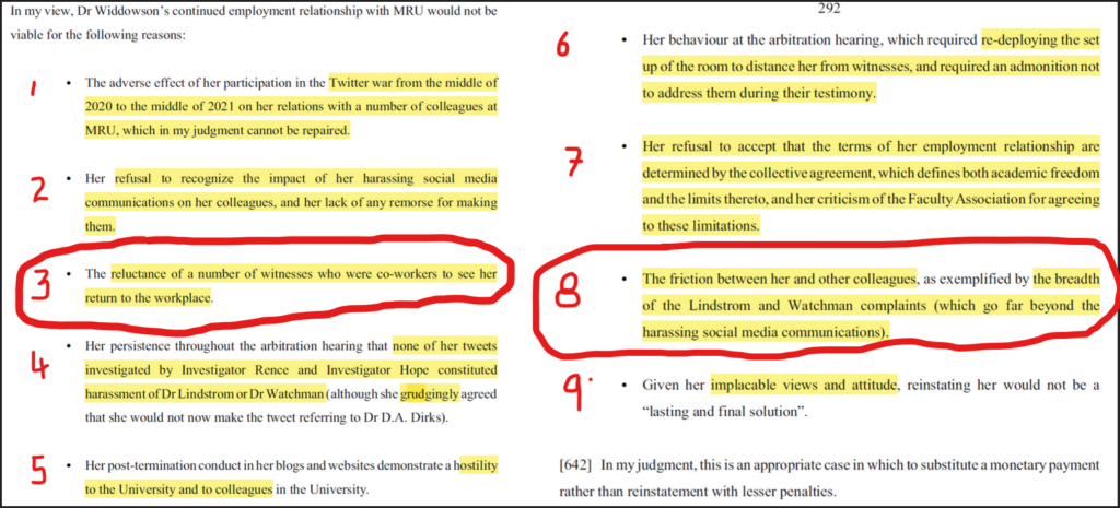 This second post is about how trans activism impacted the failure to reinstate Widdowson. Although Arbitrator David Phillip Jones found that Widdowson had been wrongfully terminated from Mount Royal University, he maintained that she could not be reinstated because, among other things, there was a “reluctance of a number of witnesses who were co-workers to see her return to the workplace” and “friction between her and other colleagues…”.