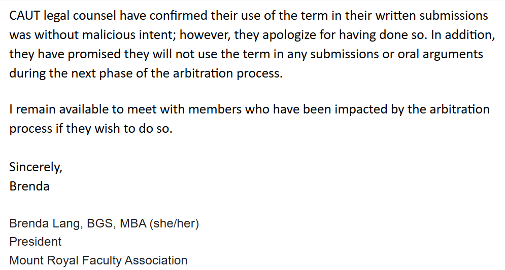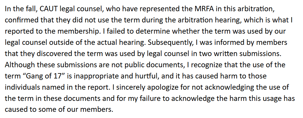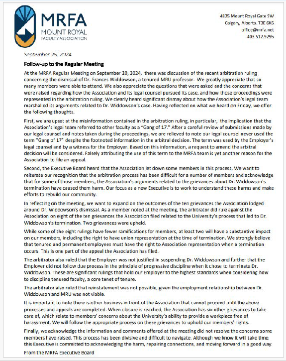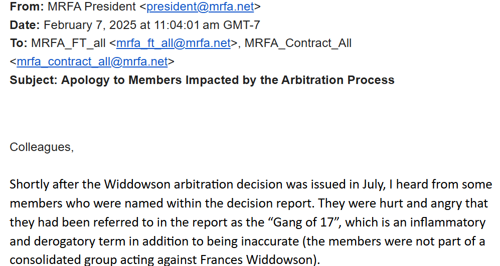 On February 7, 2025, the MRFA President sent out another email, presumably because some faculty members had seen the submission that the MRFA had asked Widdowson to remove in December 2024, which showed that the MRFA had used the phrase the “Gang of 17” in its defense of Widdowson.
