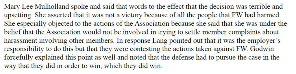A few days after this meeting, on September 25, 2024, the MRFA Executive Board sent out an email to all members regretting that the arguments put forward to defend Widdowson had “caused them harm”.