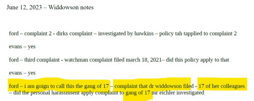 Although Widdowson did not intiate the term “Gang of 17”, it was false and highly prejudicial to Widdowson’s case for the union president Brenda Lang to state that term was inaccurate. What occurred was that Widdowson was subjected to an academic mobbing on Twitter that was supported by about 40 MRU faculty members. With respect to the “Gang of 17”, Widdowson documented this in the 17 complaints that she filed in February and March 2021.