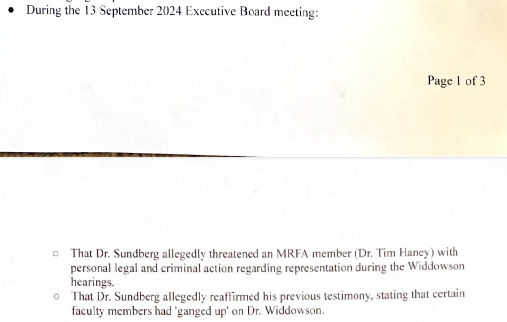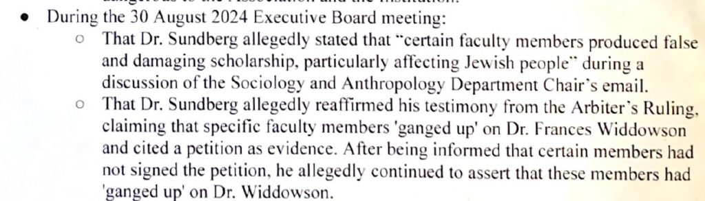 Another person prevented from attending the September 20, 2024 meeting was Kelly Sundberg, the Senior Grievance Officer. This was in part because Sundberg had said that Widdowson had been “ganged up” on by a number of faculty members. This was complained about by another board member, Milena Radzikowska.
