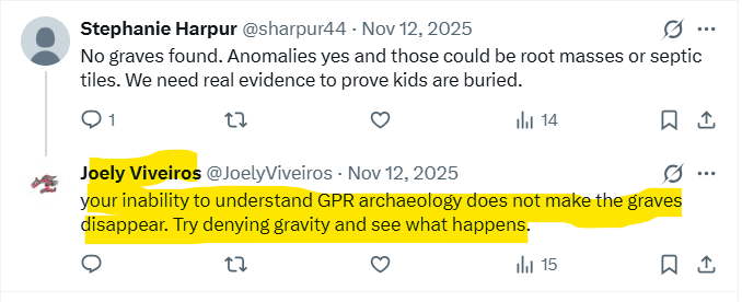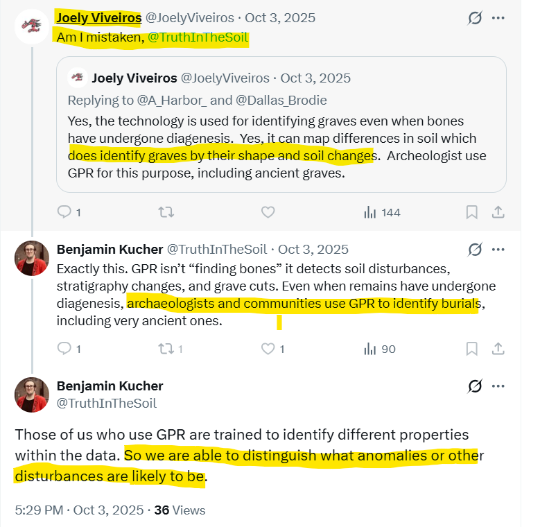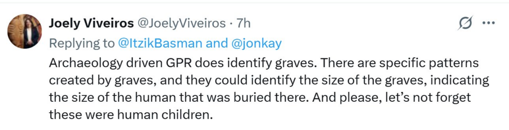 As a result of the exchanges that occurred before Viveiros blocked Widdowson, it was discovered that Viveiros was asserting that GPR identifies graves. Viveiros continues to argue this, apparently as a representative of UBC.