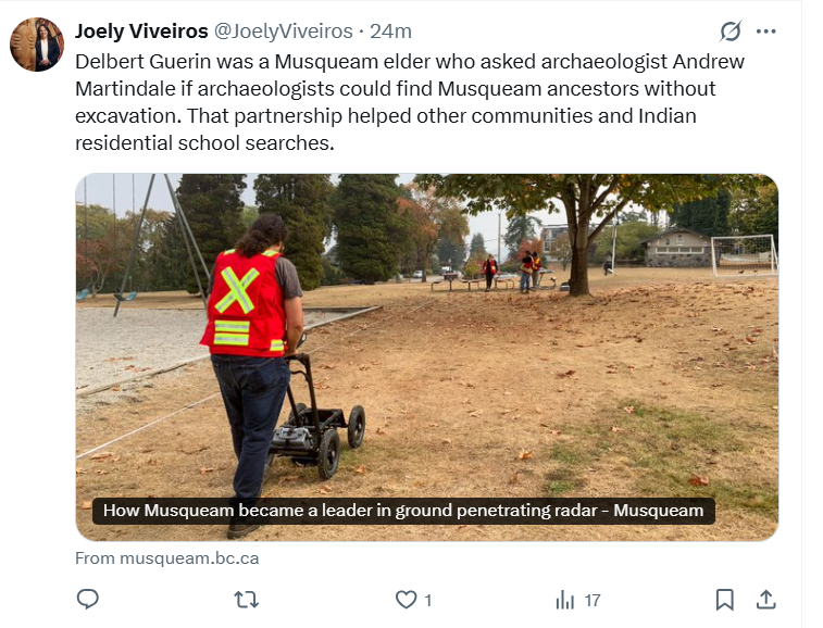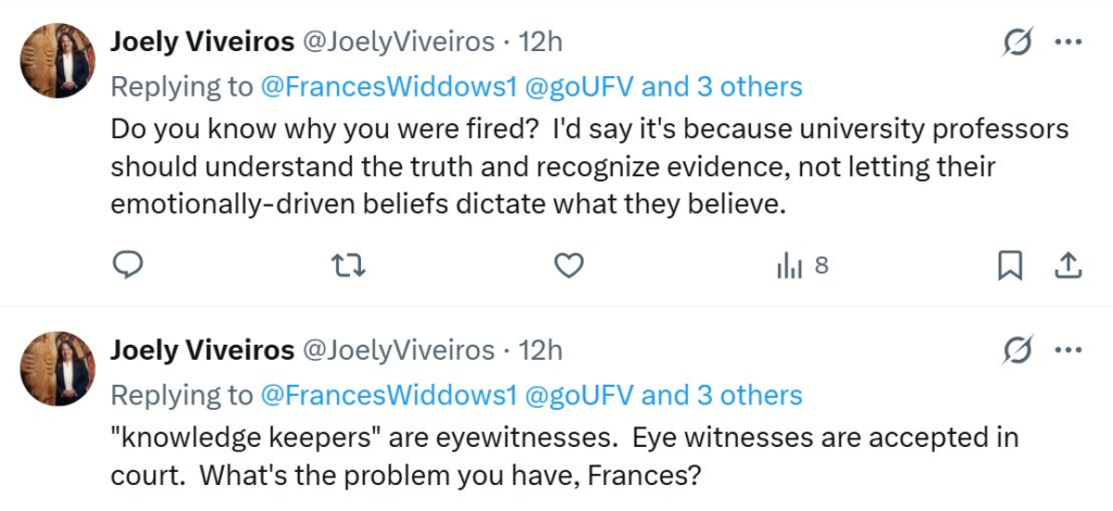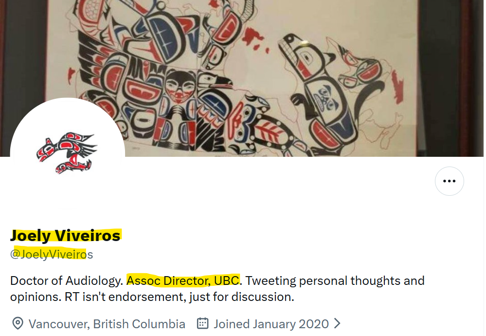 Widdowson became aware of Viveiros when she learned that the Acting/Associate Director had made assertions that are tied to UBC’s perpetuation of falsehoods about the “unmarked graves” on “X”. On this account, Viveiros identifies as an “Assoc Director, UBC”.