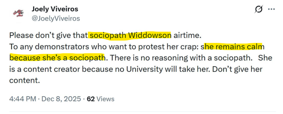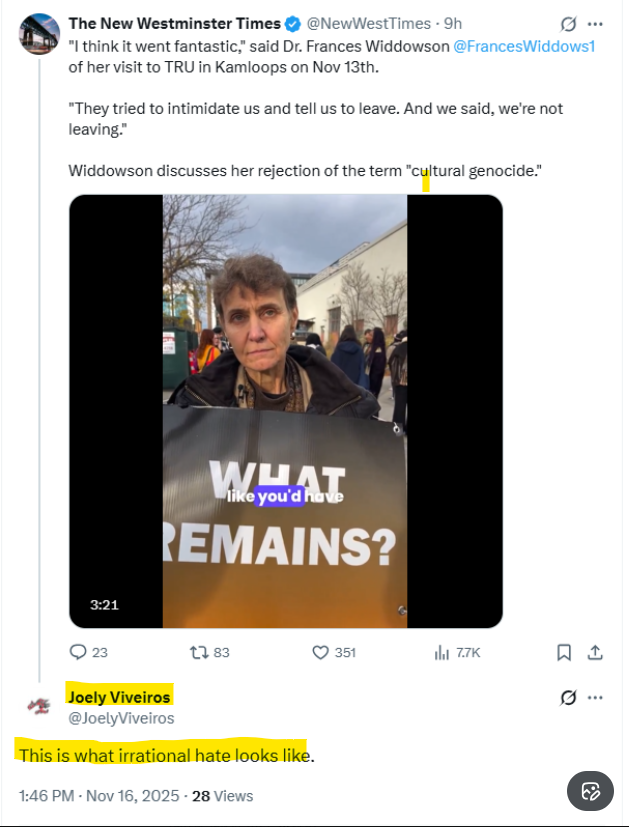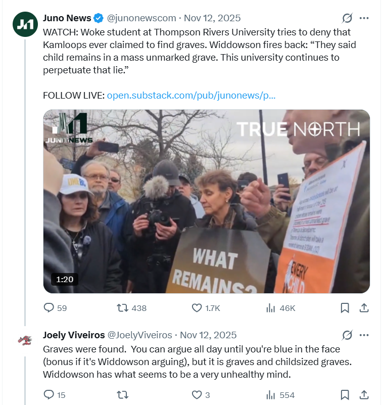 Viveiros also called Widdowson a “sociopath” after the meltdown at The University of Victoria on December 2, 2025, asserting that this is why she “remains calm” when discussing the evidence for “What Remains?” at the former Kamloops Indian Residential School.