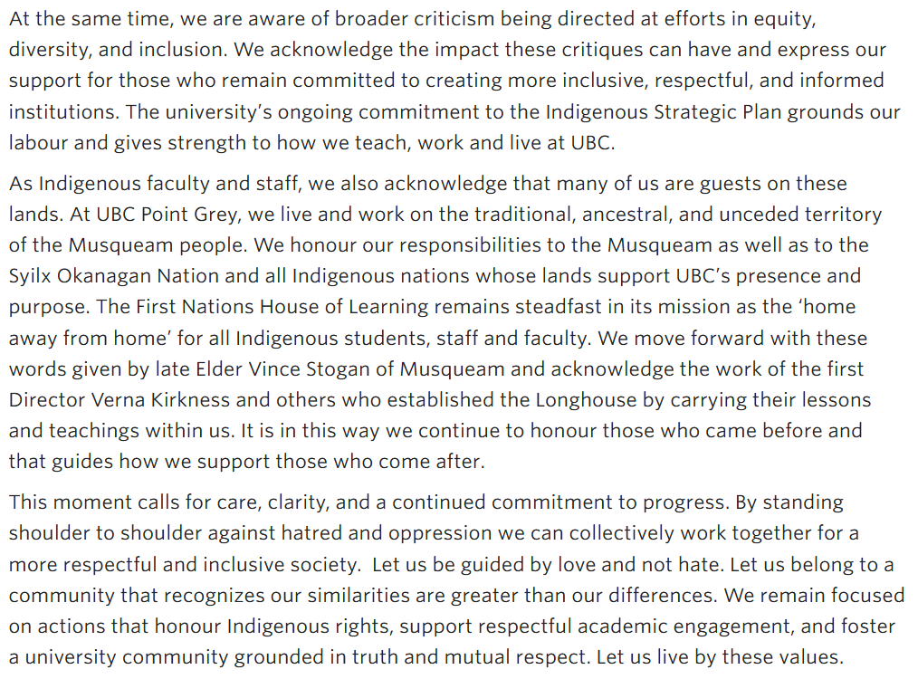 It is likely that this letter was sent out in response to four UBC professors challenging land acknowledgements and Equity, Diversity, and Inclusion initiatives at the university.