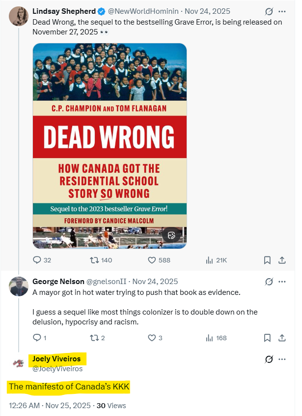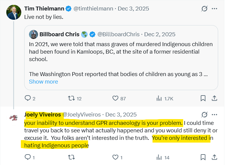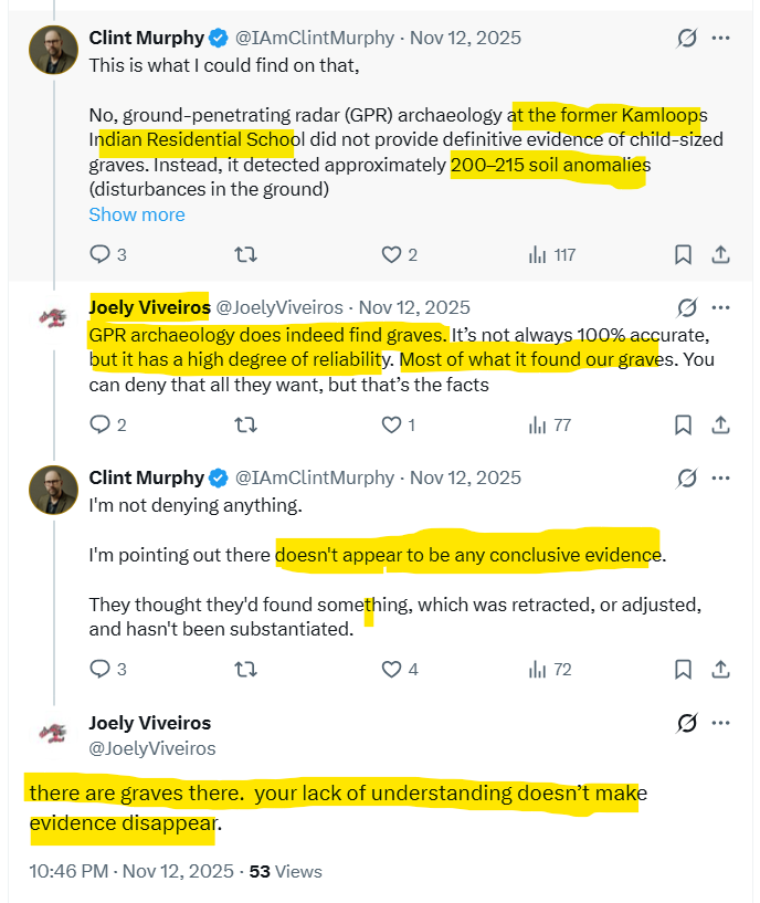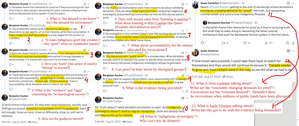 Relatively early on in these exchanges – on October 3, 2025, Viveiros appeared to have some doubts about the claims that she was making. She was reassured in her falsehoods by the University of Alberta graduate student Benjamin Kucher, who is associated with the advocacy archaeologist Kisha Supernant.