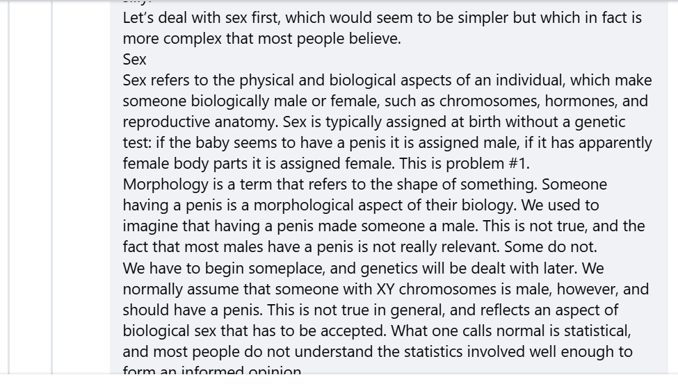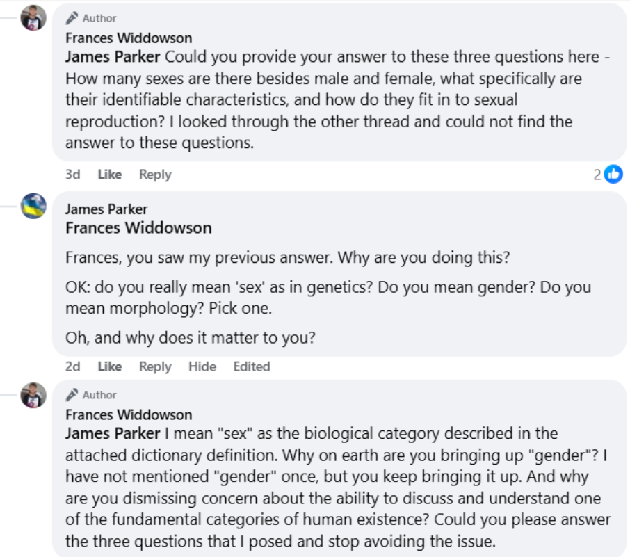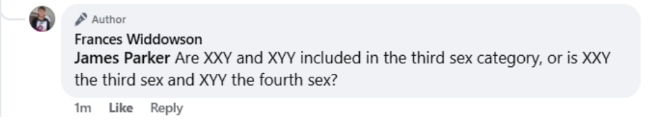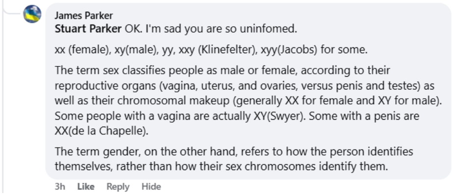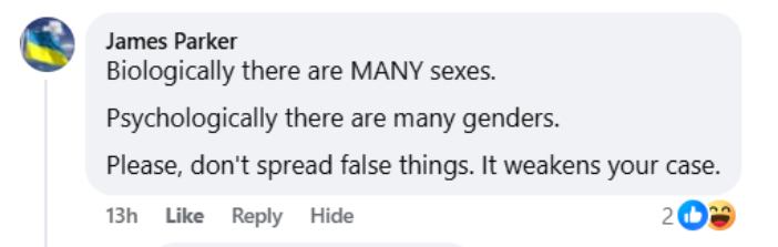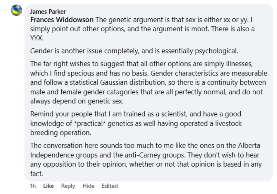 This discussion has been a major point of contention on Widdowson’s Facebook page. The most prolific proponent of the view that there are more than two sexes is James Parker, a professor at the University of Calgary.